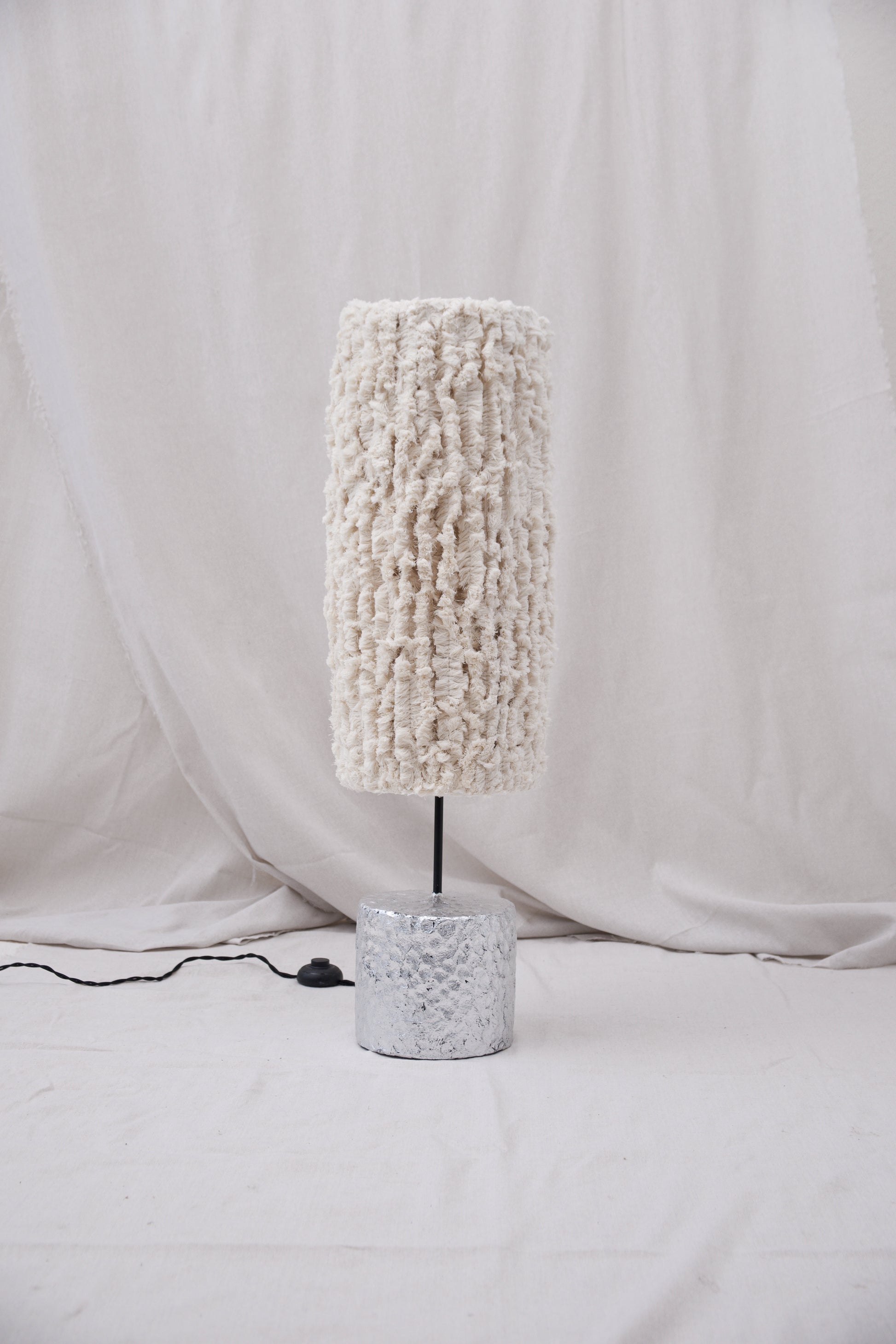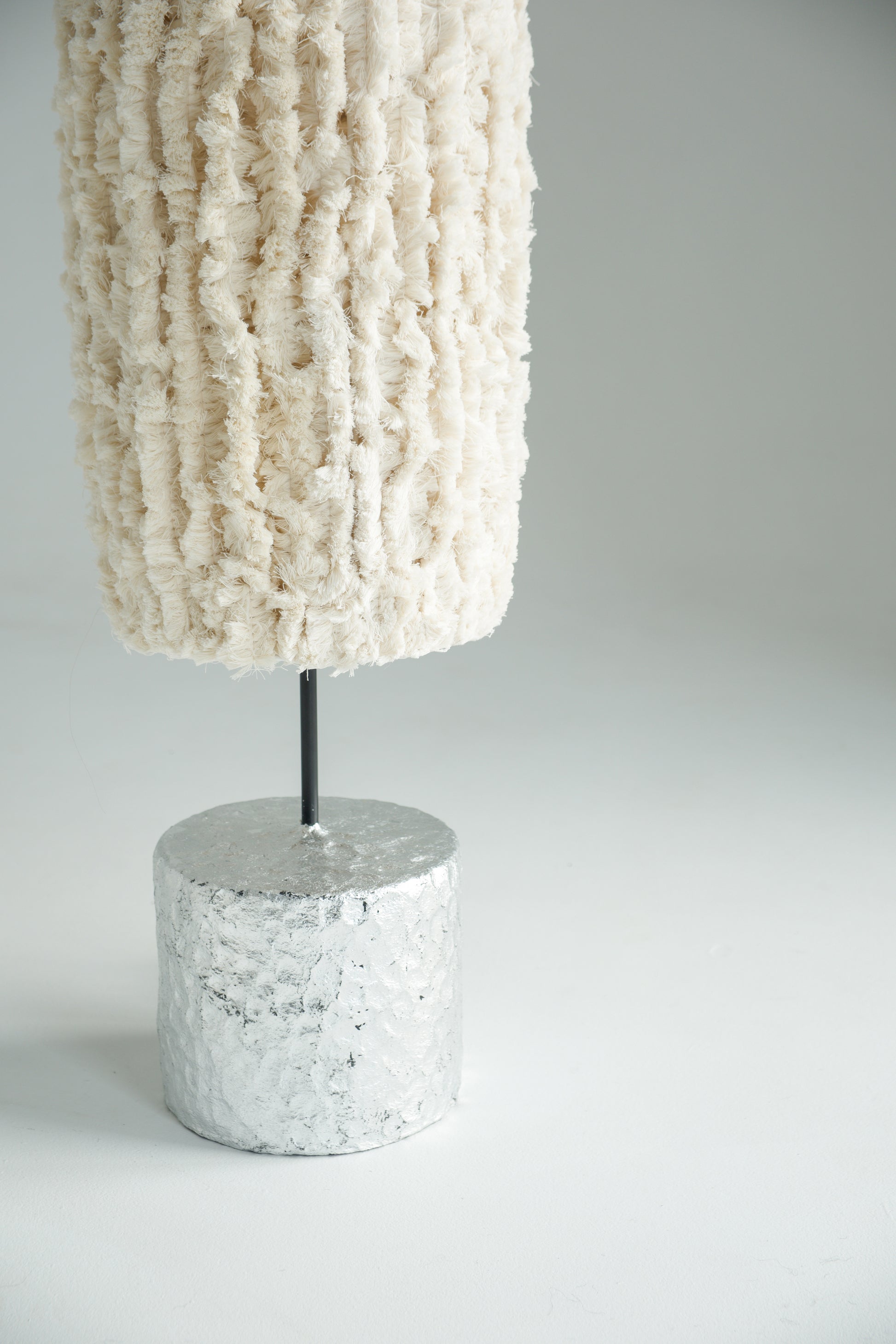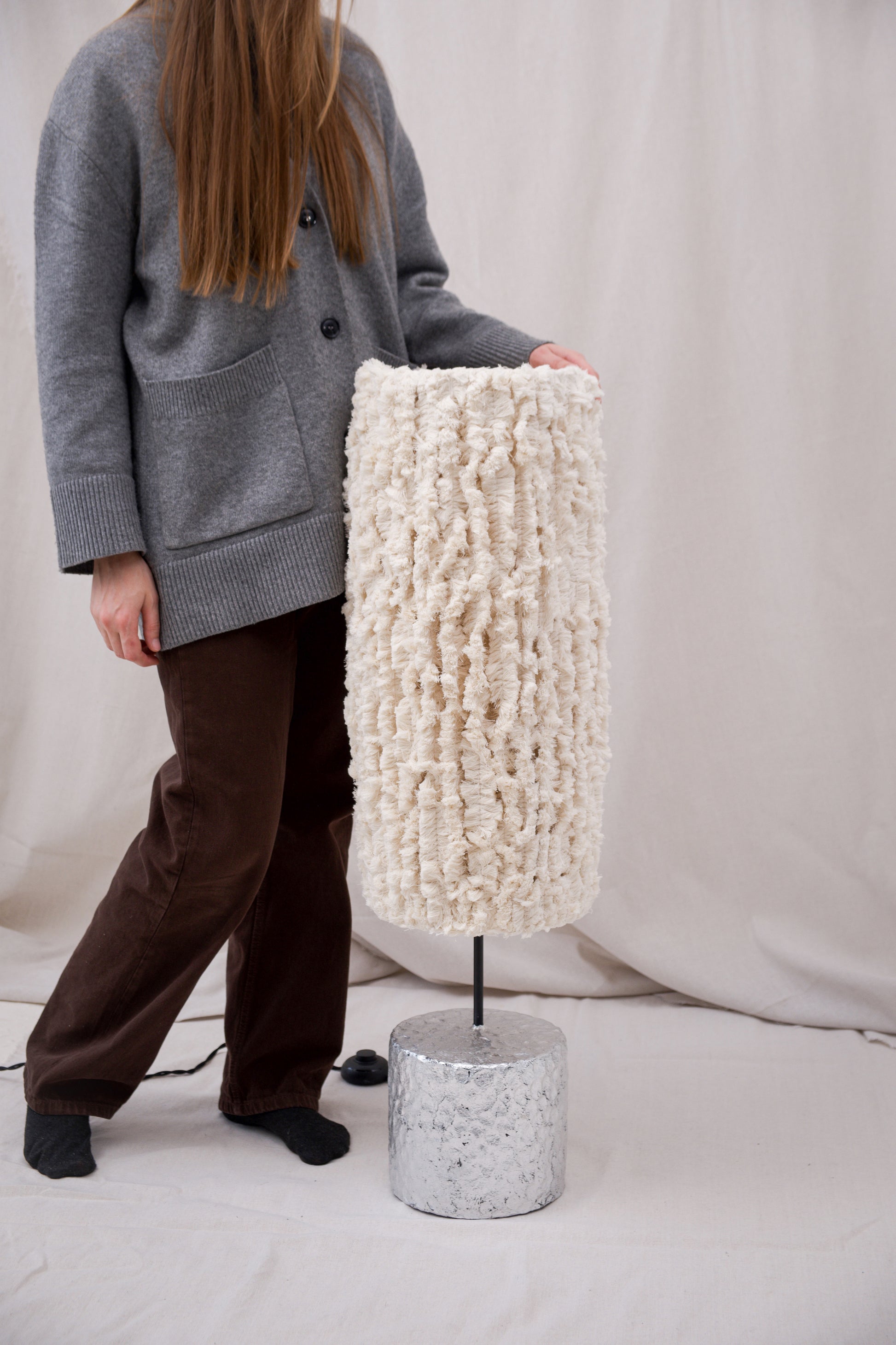 Абажур з бавовняної бахроми кольору айворі м’яко розсіює світло, створюючи теплу, обволікаючу атмосферу та делікатний візуальний рух. Контраст між м’якою текстилевою поверхнею та холодним металевим тоном основи формує врівноважену, сучасну композицію.