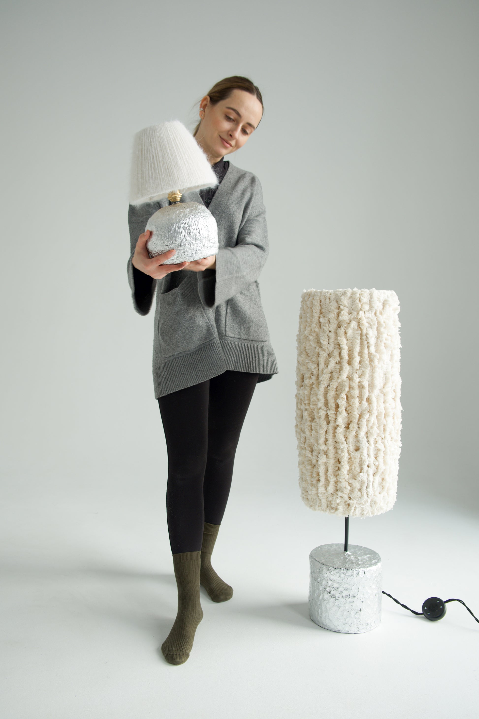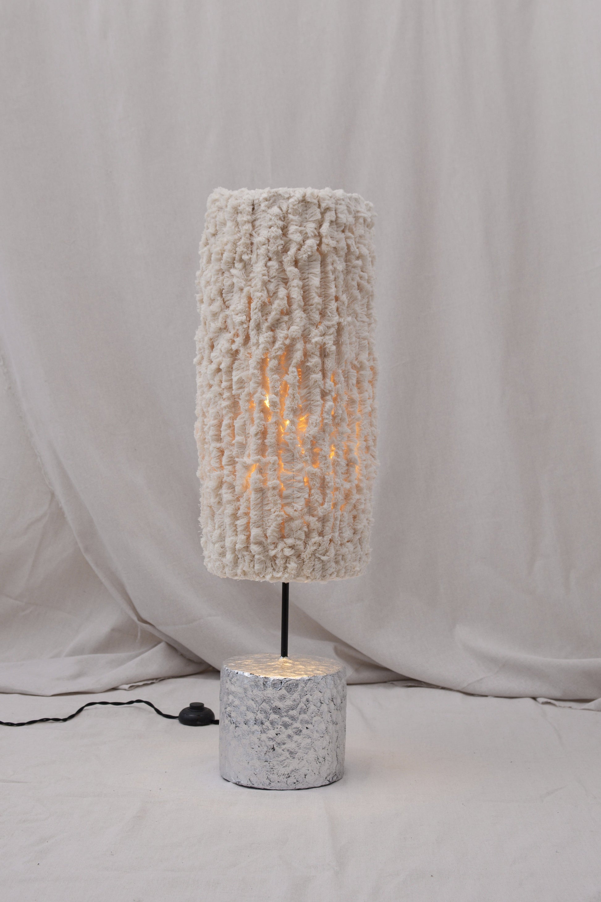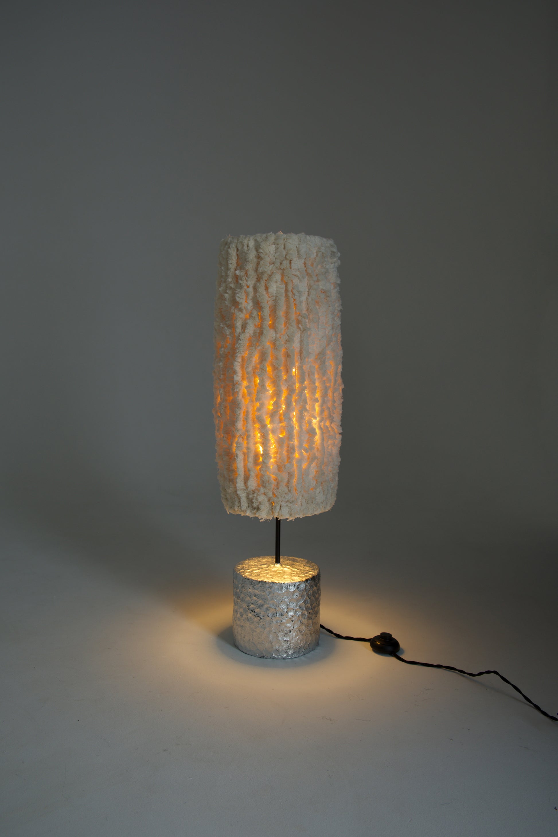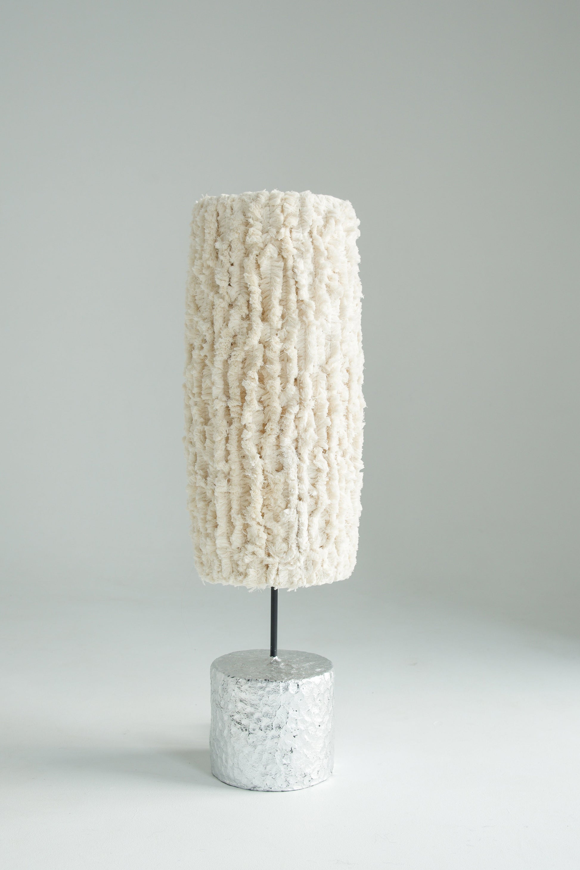 Абажур з бавовняної бахроми кольору айворі м’яко розсіює світло, створюючи теплу, обволікаючу атмосферу та делікатний візуальний рух. Контраст між м’якою текстилевою поверхнею та холодним металевим тоном основи формує врівноважену, сучасну композицію.