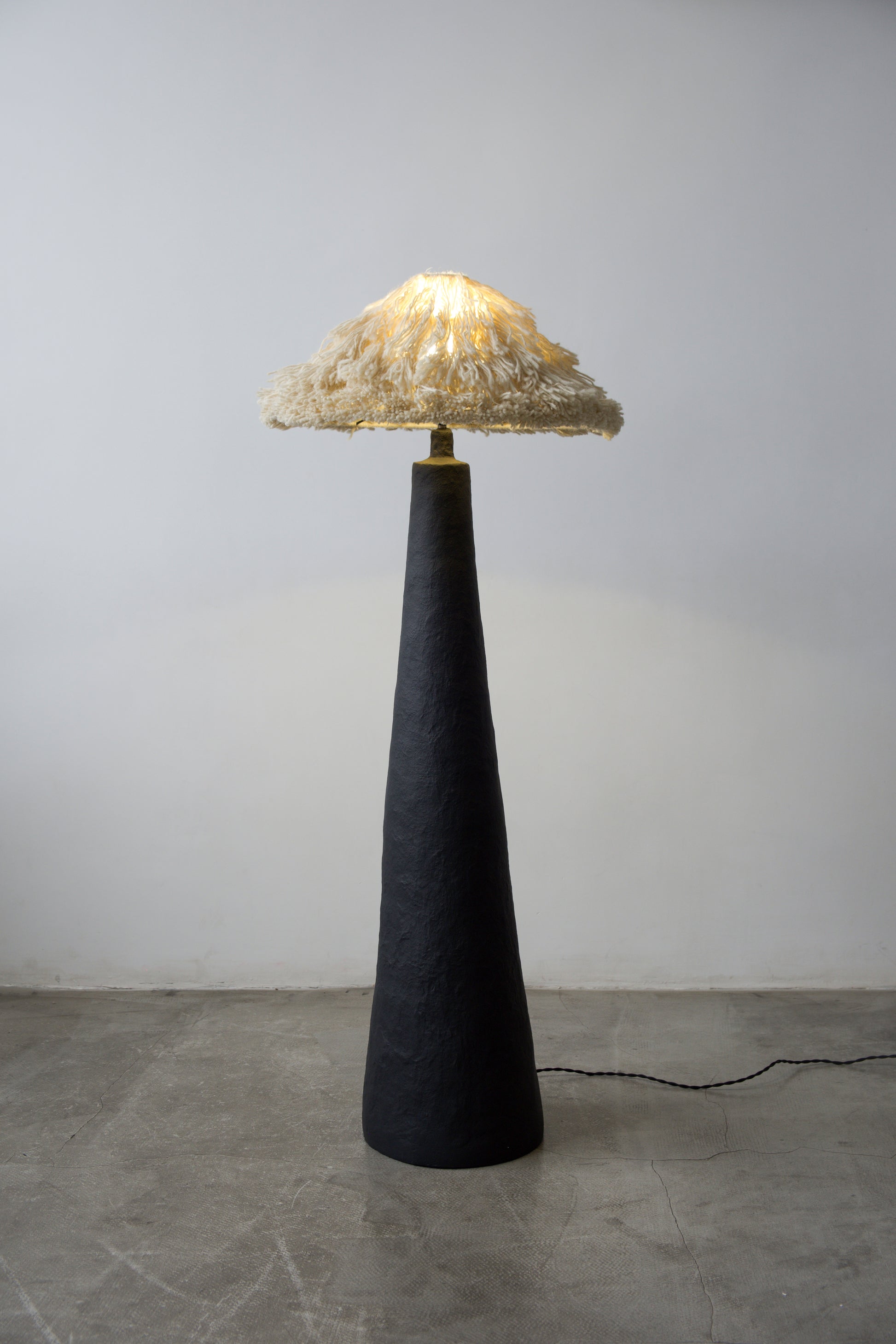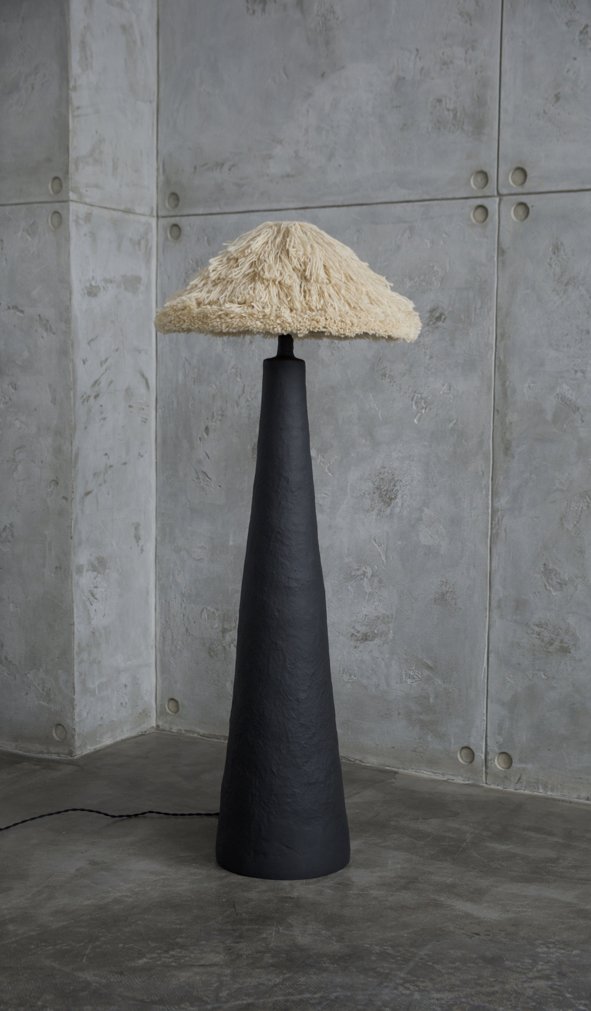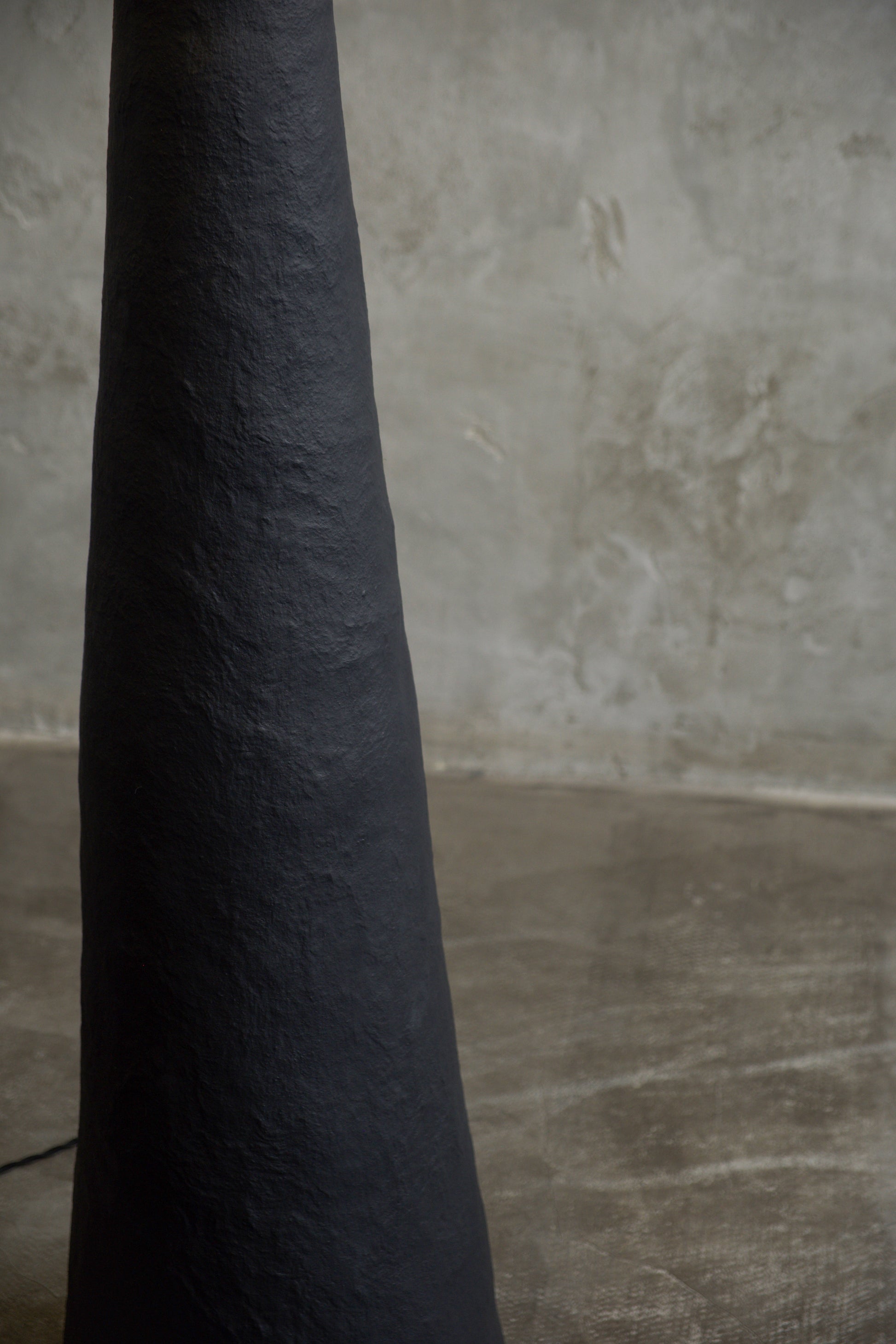 У цій версії торшер має основу, вручну сформовану з Pleto Biocomposite™ — авторського натурального матеріалу PletoStudio на основі мінеральних компонентів і органічних волокон. Матеріал формується без жорстких шаблонів, тому кожен виріб зберігає живу фактуру, легкі нерівності та сліди ручної роботи. Поверхня пофарбована в глибокий чорний матовий колір, що підкреслює монолітний силует і надає обʼєкту відчуття стійкості та спокою.