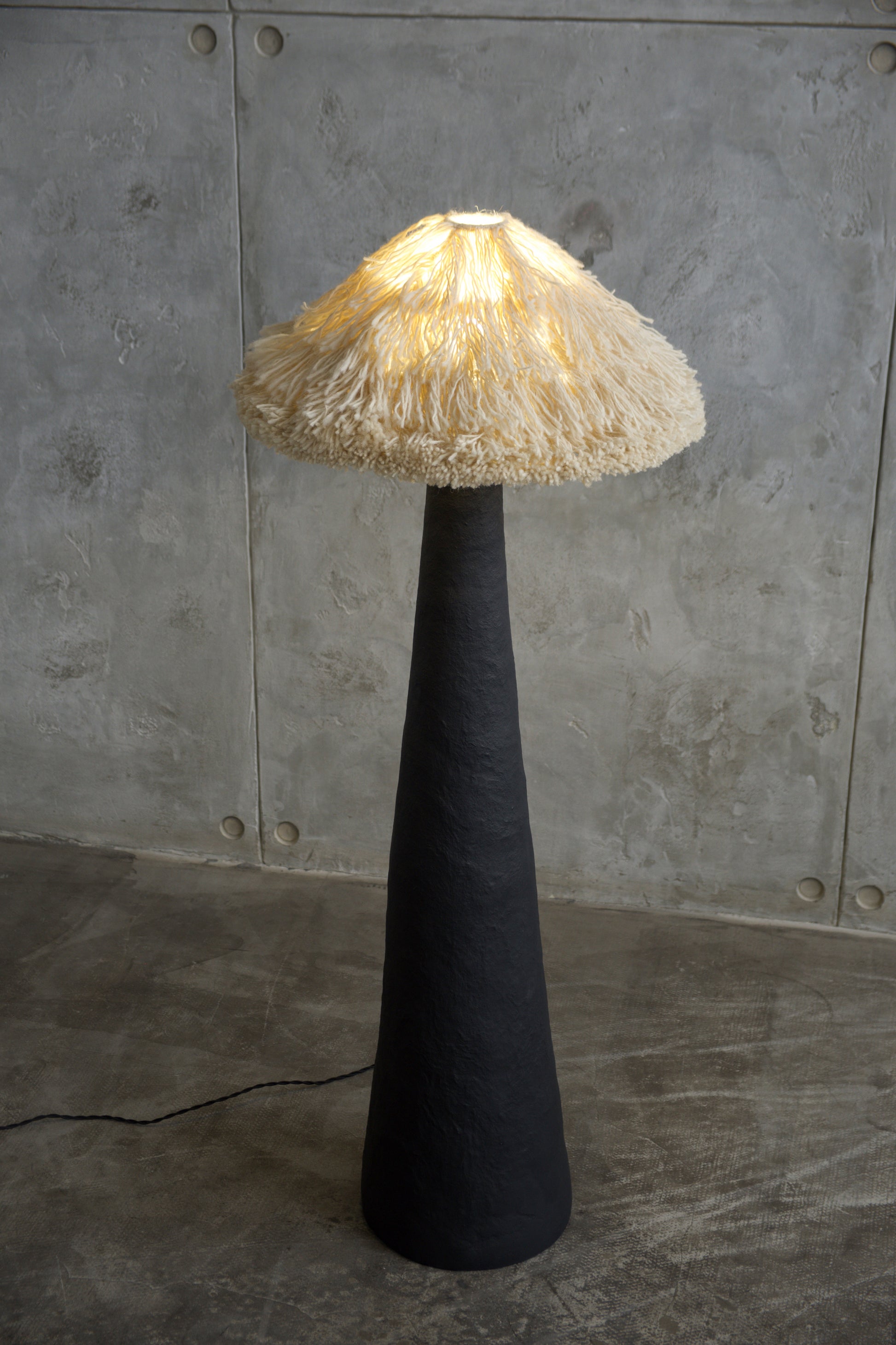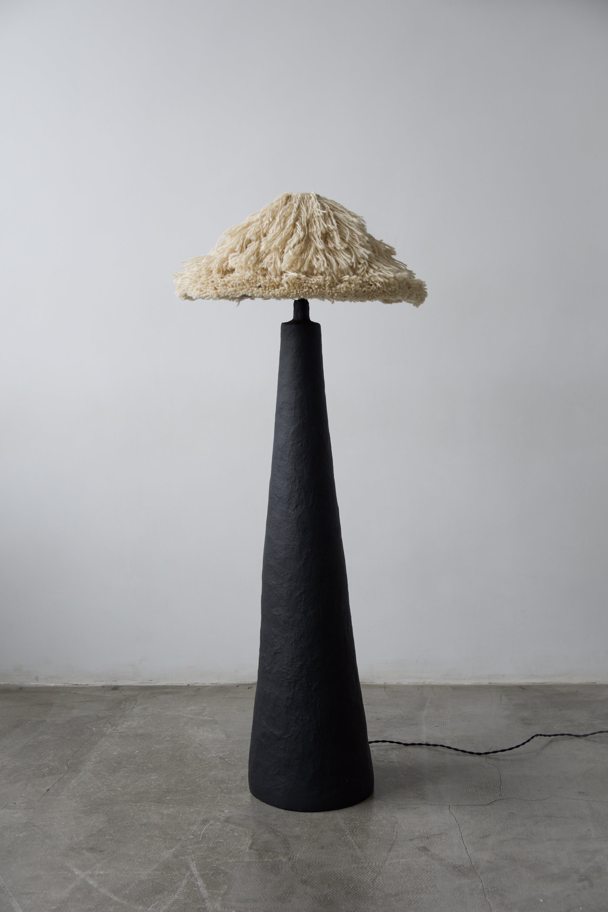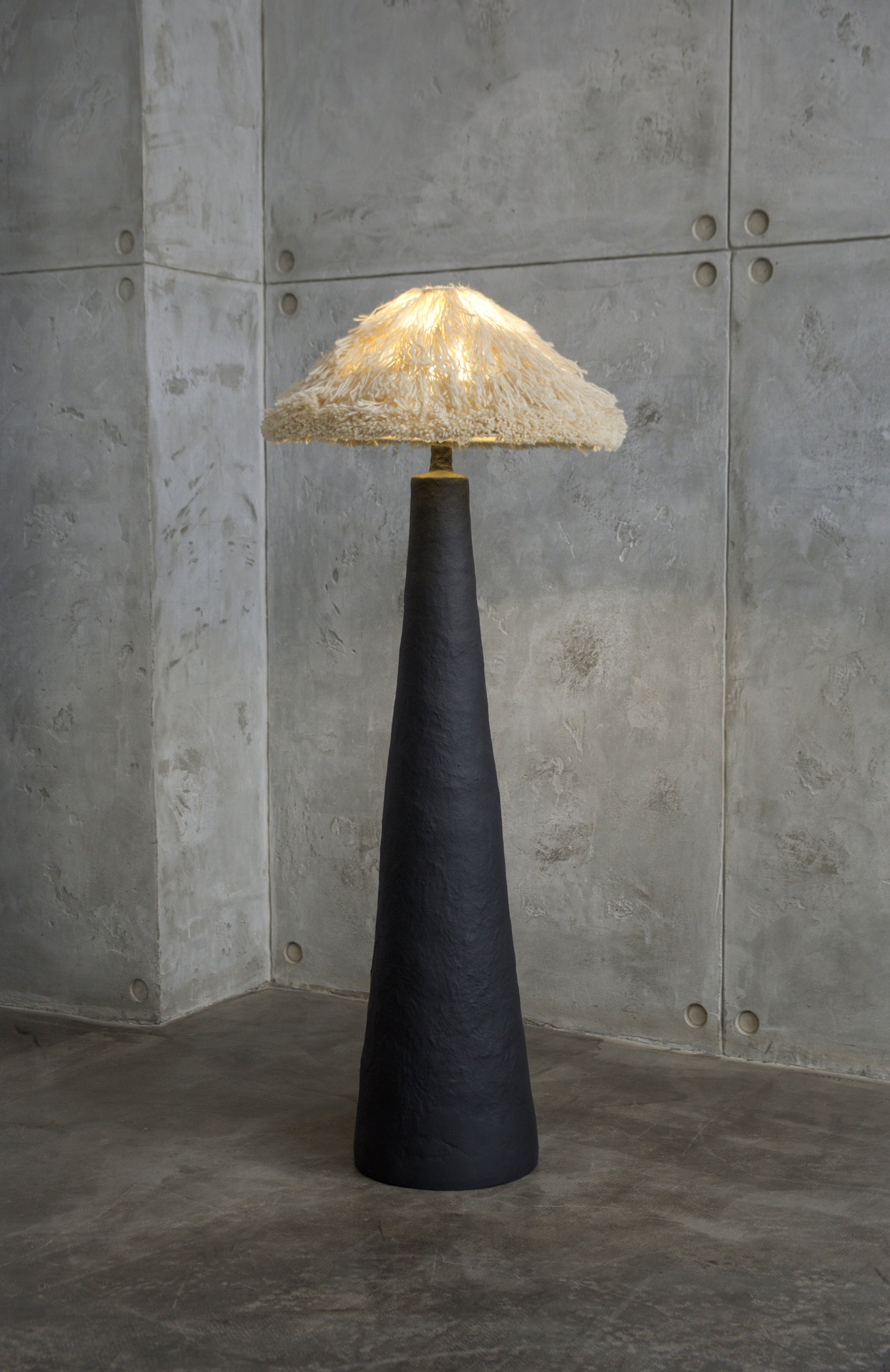 У цій версії торшер має основу, вручну сформовану з Pleto Biocomposite™ — авторського натурального матеріалу PletoStudio на основі мінеральних компонентів і органічних волокон. Матеріал формується без жорстких шаблонів, тому кожен виріб зберігає живу фактуру, легкі нерівності та сліди ручної роботи. Поверхня пофарбована в глибокий чорний матовий колір, що підкреслює монолітний силует і надає обʼєкту відчуття стійкості та спокою.