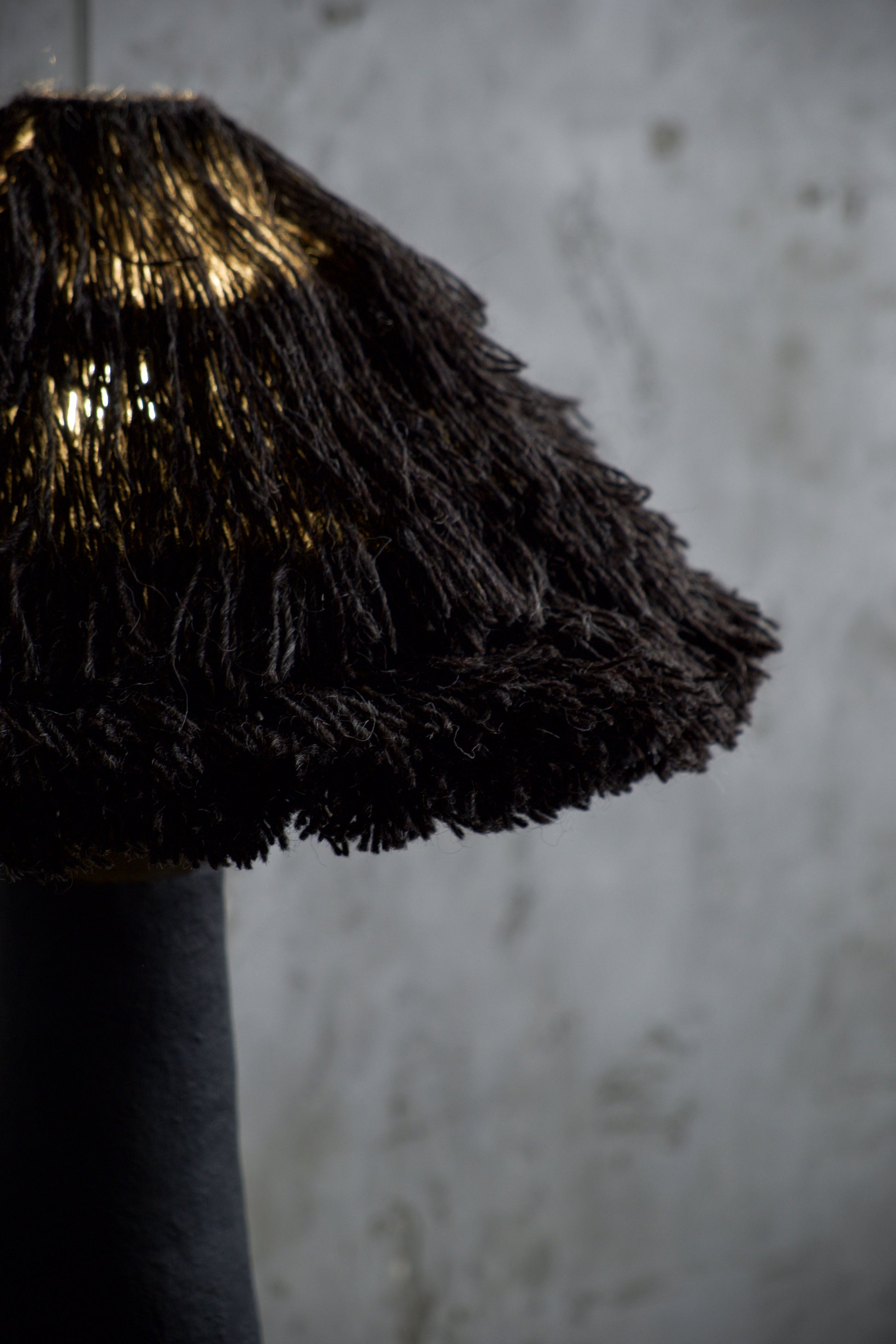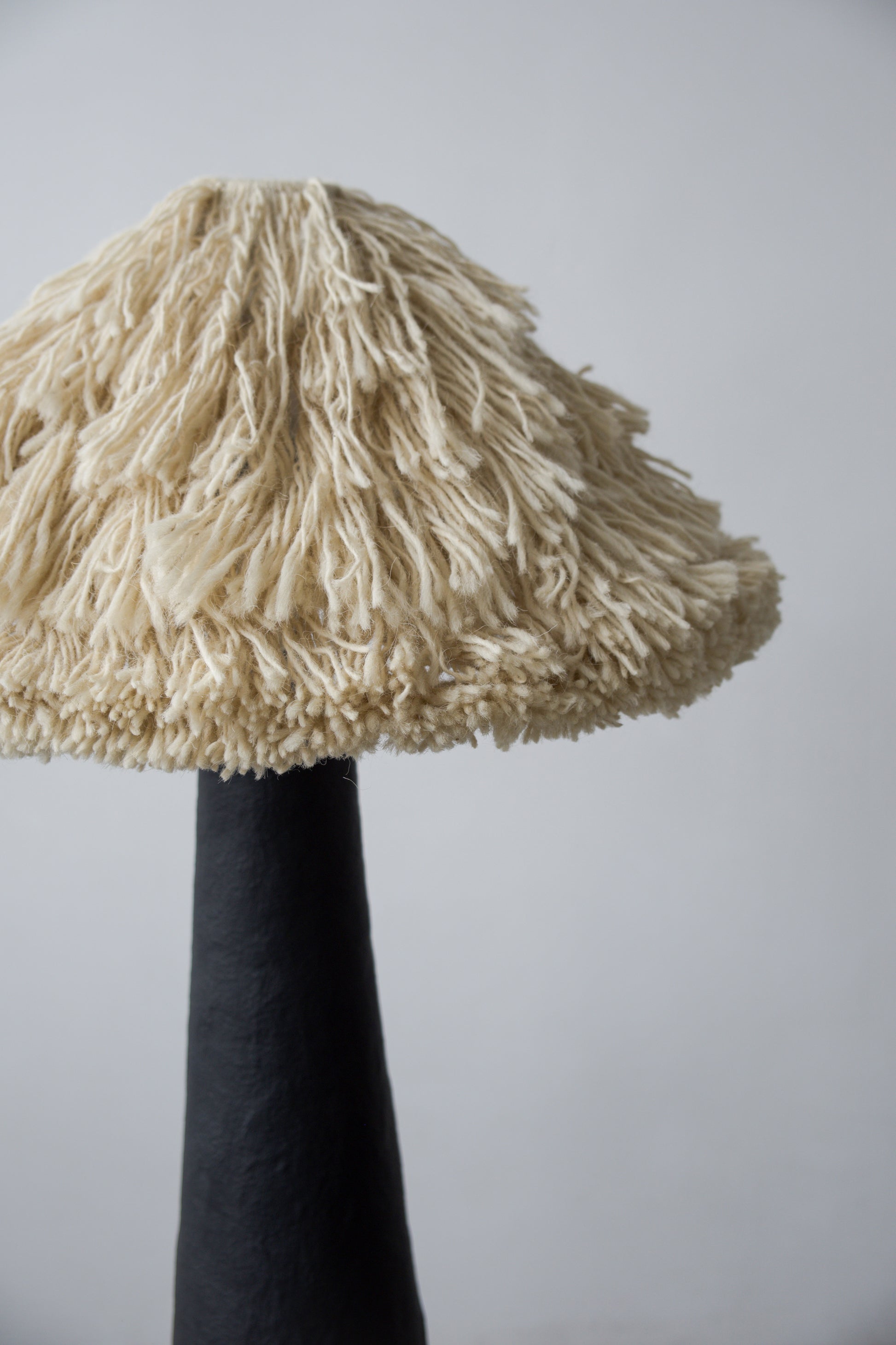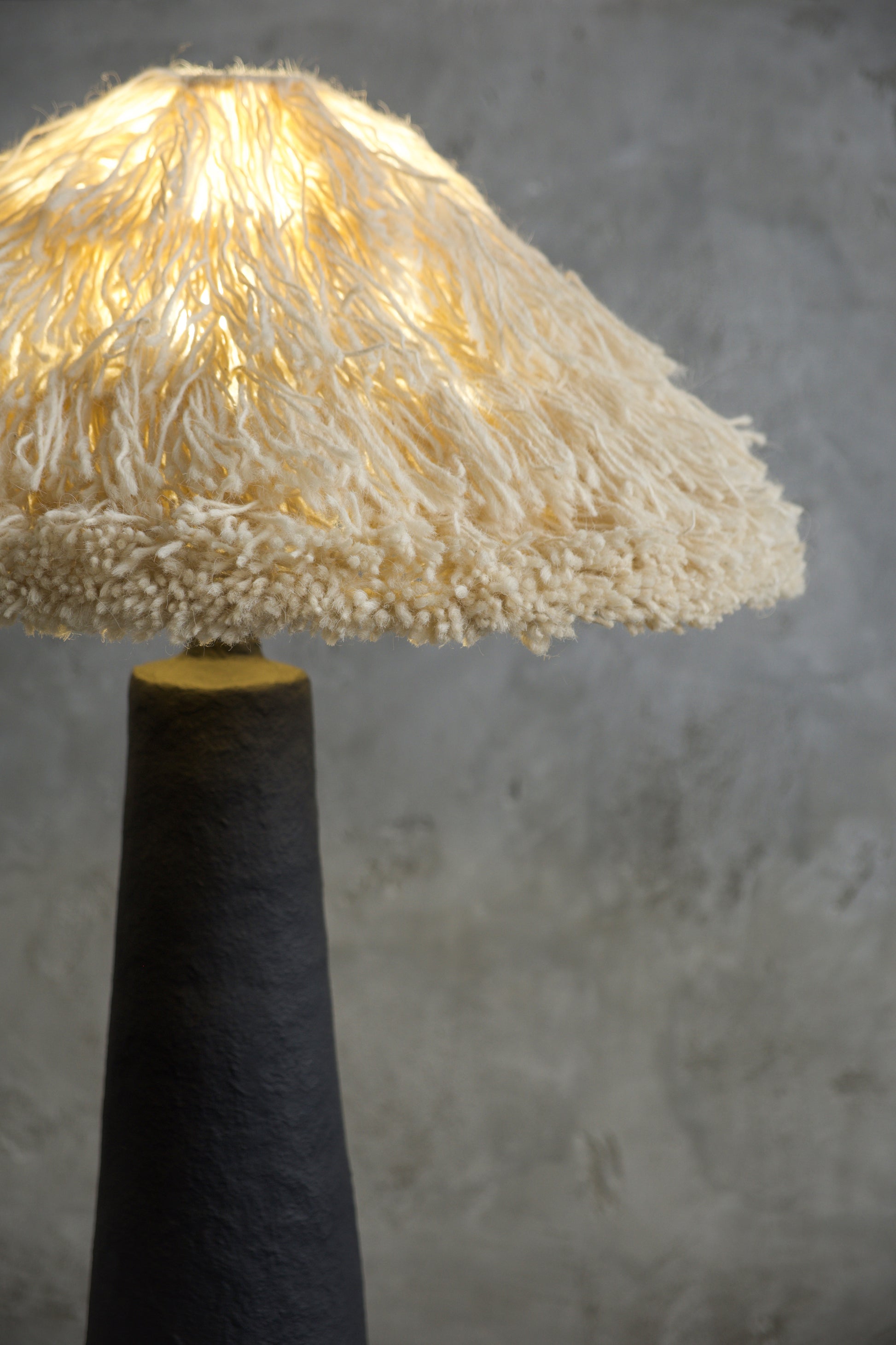 Абажур виготовлений вручну з натуральної вовни. Він доступний у двох відтінках — айворі або графіт. Мʼяка волокниста структура вовни делікатно розсіює світло, створюючи тепле, приглушене освітлення та формуючи природний контраст із стриманою, мінеральною основою. Світло не домінує, а мʼяко наповнює простір.